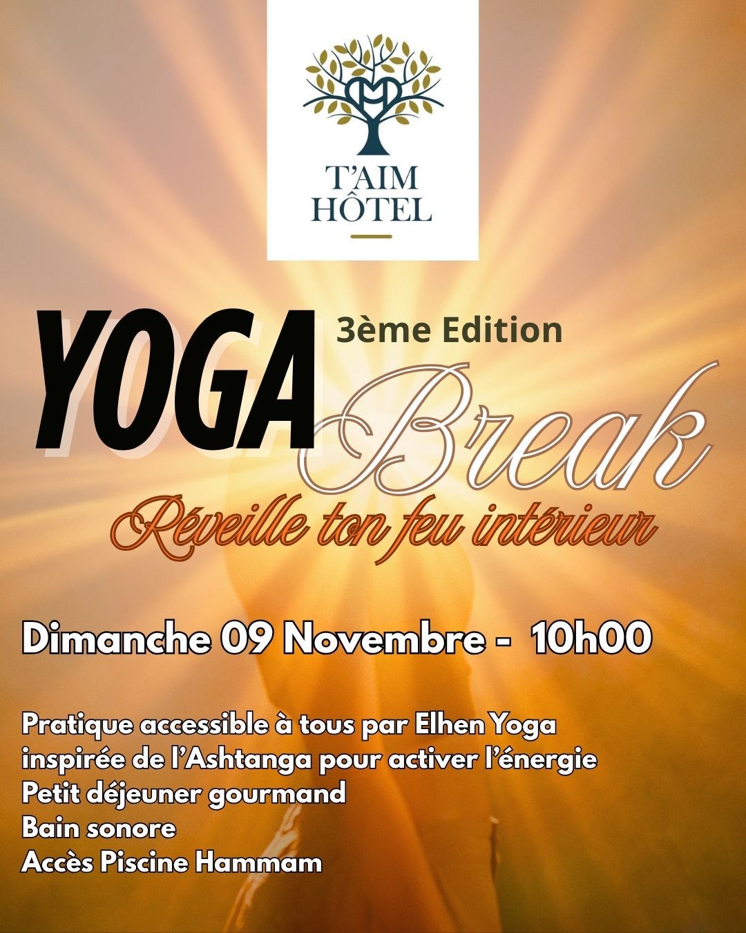 Dimanche 9 Novembre 10h - 12 h / 49€ avec séance, acceuil petit déjeuner et accès piscine hammam